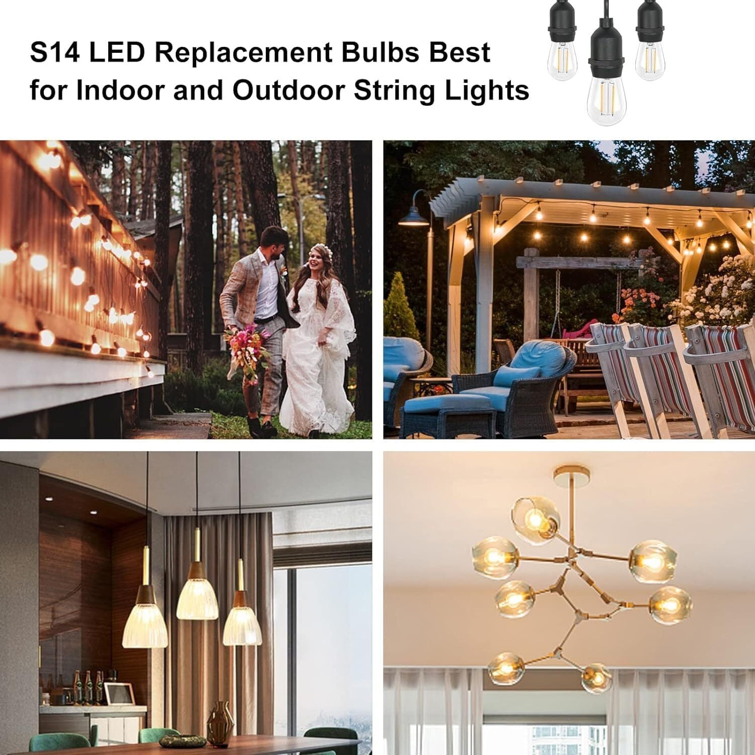 - 【Wide Application】- S14 LED bulb ideal for patio string light, wedding decor bulbs, lanterns, front porch light, post light, signs, and marquee lighting. Indoor application: sputnik chandeliers, ceiling fan bulbs, vanity light, bathroom lighting, wall sconces, etc.