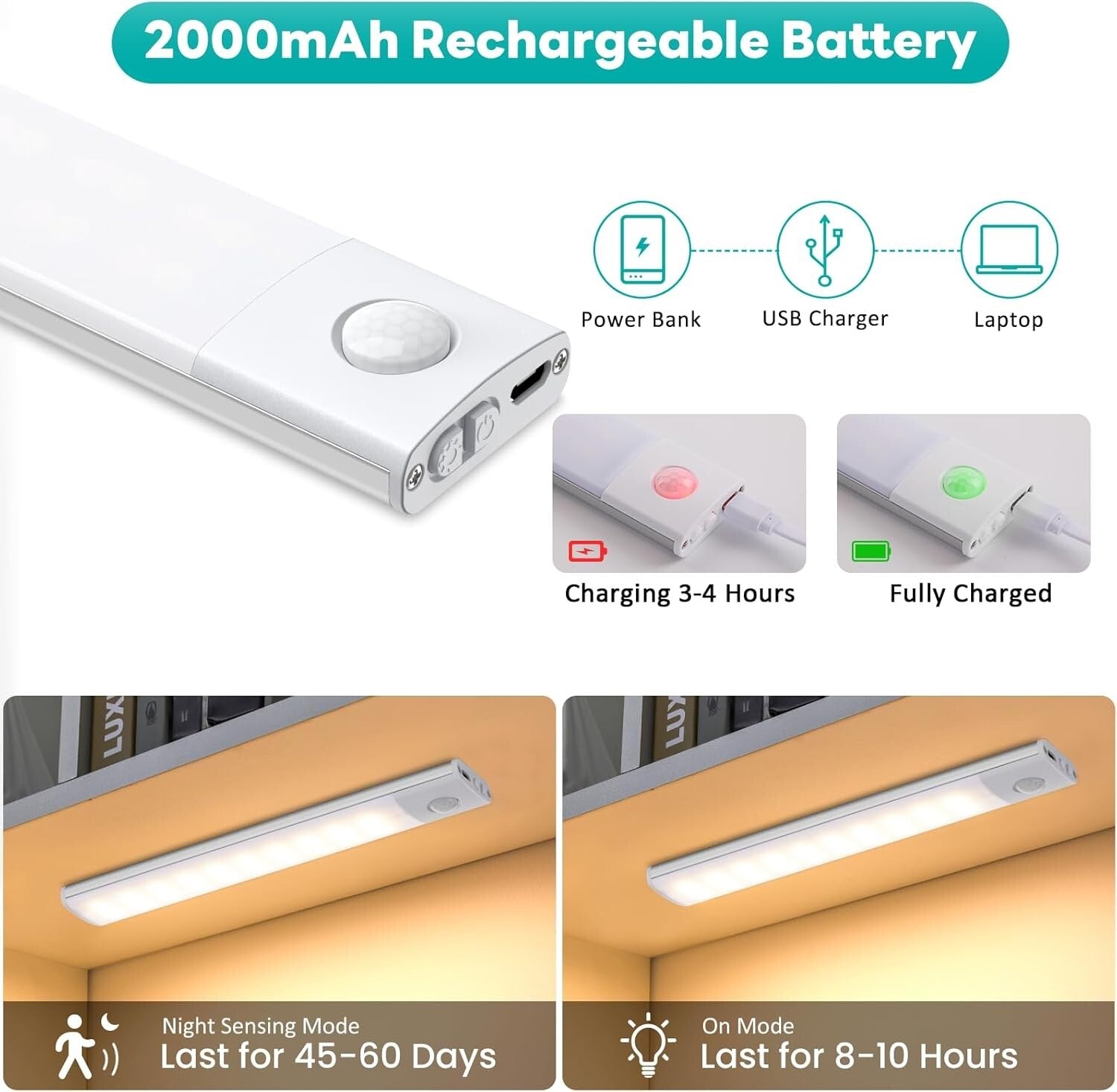 The under cabinet kitchen lights built-in 2000mAh high-capacity rechargeable battery. The night lights can be charged at anywhere and anytime by USB device (such as USB adapter, power bank, laptop). After being fully charged, motion sensor led strip light can last for 8-10 hours in ON mode and 45-60 days (6-8 times everyday) in sensor mode.