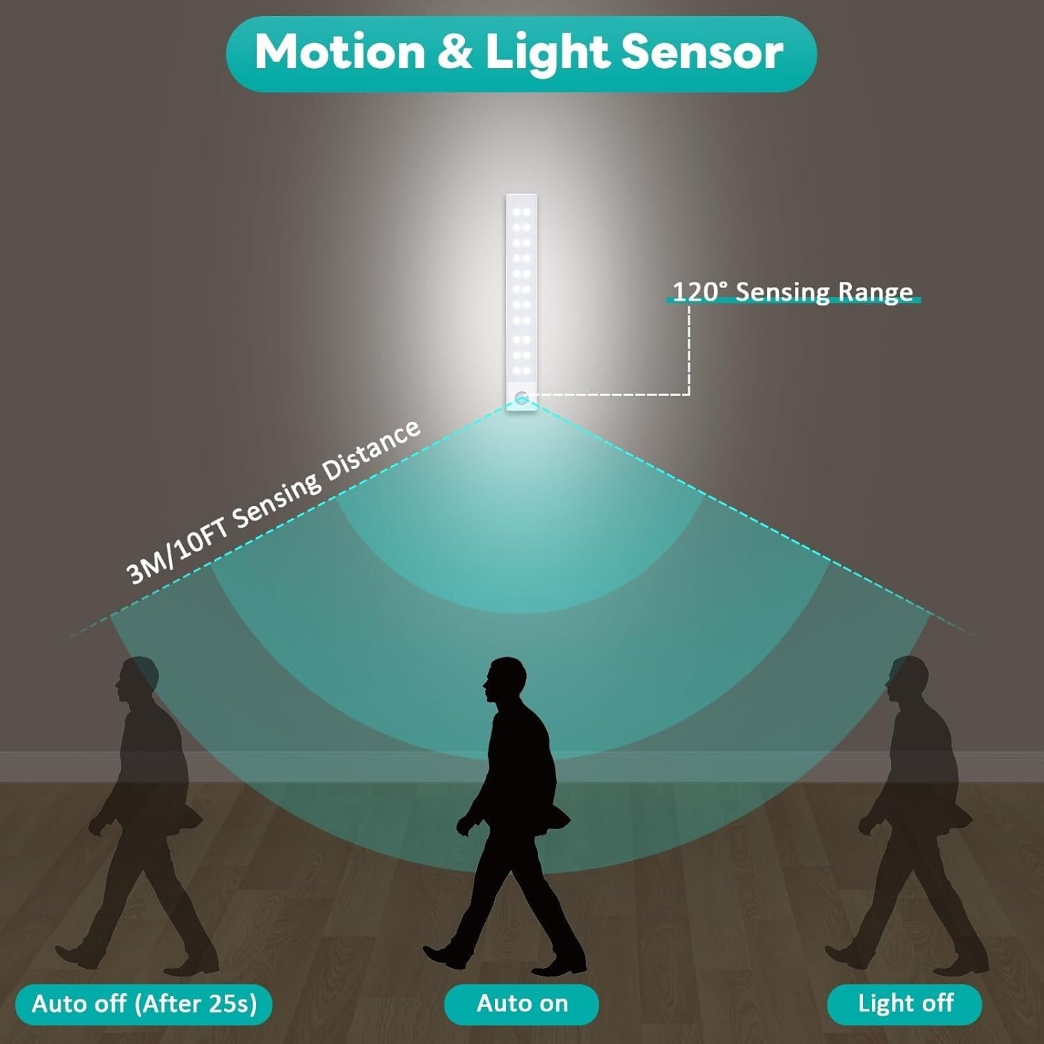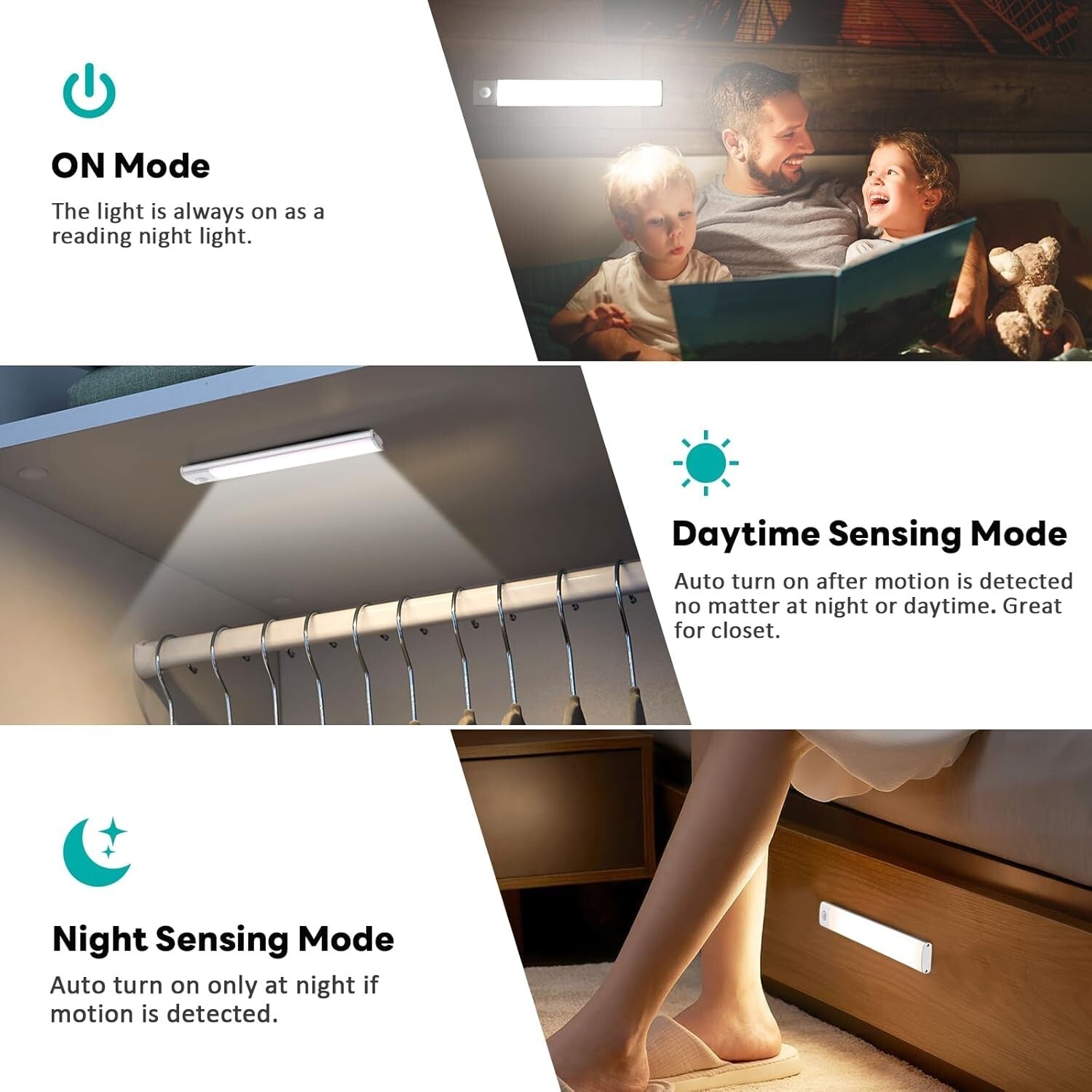 The motion sensor lights Indoor has 3 modes: ①ON mode: The cupboard light will be lighting for 8-10 hours if it is full charged. ②All day sensor mode: Auto turn on after motion is detected no matter at night or daytime. ③Night sensor mode: Auto turn on only at dark night after motion is detected. Motion sensor wardrobe light can automatically light up when detect movement at a range of up to 3 meters within a 120° and turn off in 25s after you left.