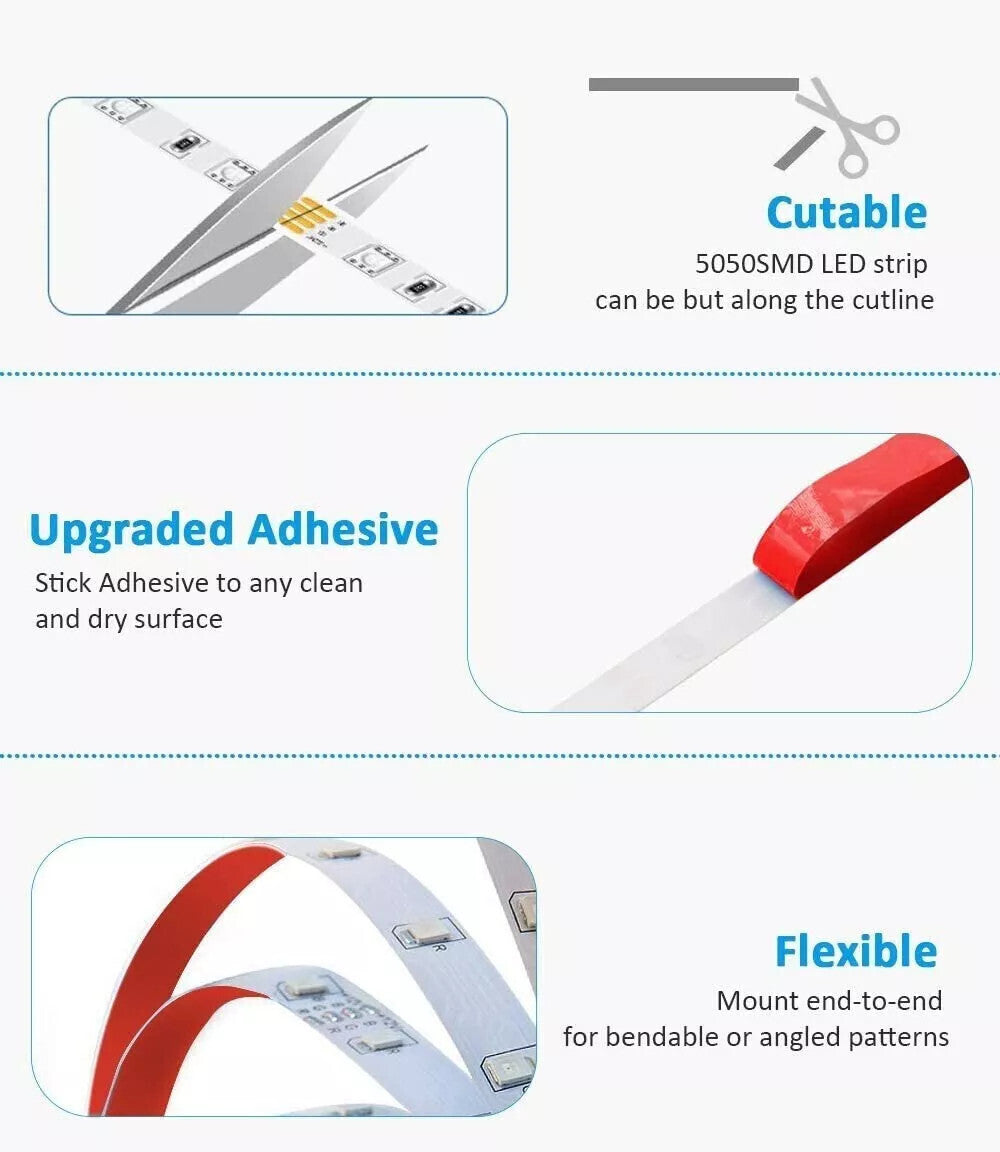 5) Led tape lights can be cut along the cutting marks. NOTE: if you slice the strip, you need to use some 5050 4 pin led strip connector or L shape connectors and more power supply to make it work.