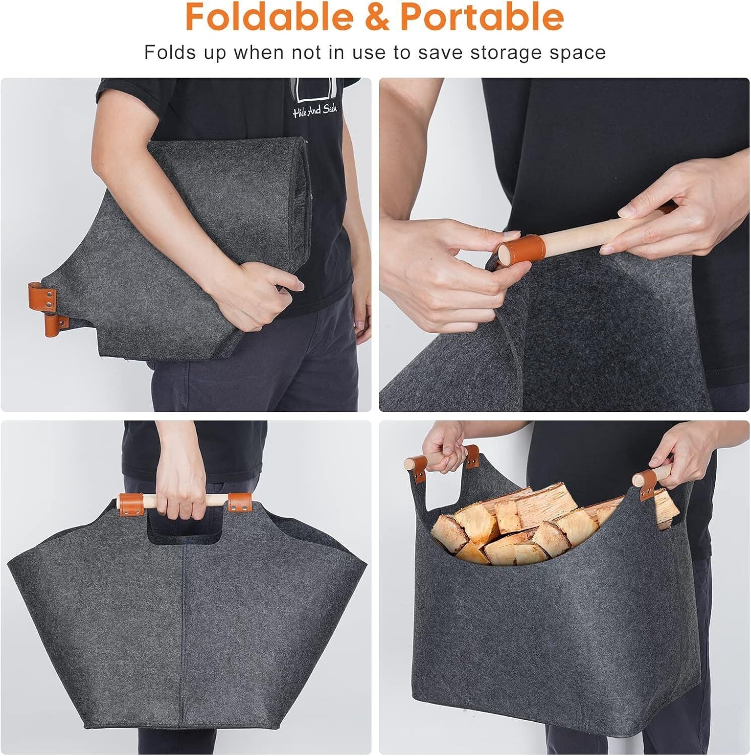 【Foldable & Portable】 --The felt firewood basket can be folded when not in use to save storage space. Comes with 2 removable and sturdy wooden handle for more easy to carry and transport. Not only can be used for sroring wood but also great for storing food while camping.