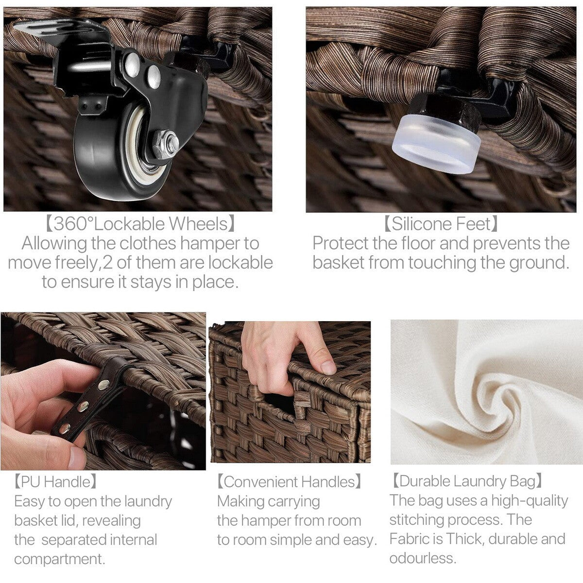 【Premium Handwoven Laundry Hamper】Crafted from durable, breathable PP woven fabric, this versatile hamper comes in two spacious sizes and five stylish colours (grey, beige, navy, black,brown). The smooth-rolling 360°lockable wheels allow easy movement between rooms without tipping.