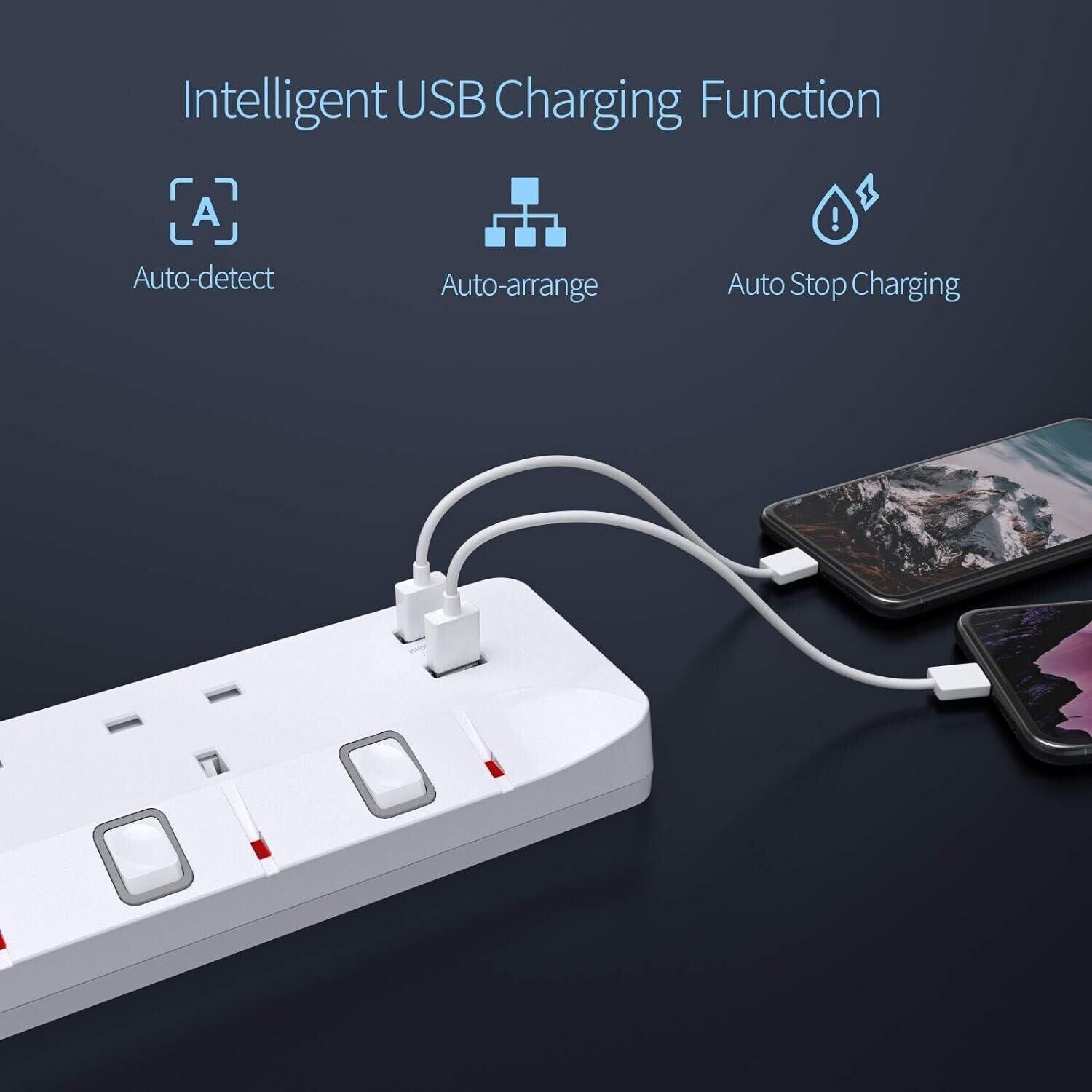 PIBEEX Extension Lead with 4 Way Plug Sockets, 13A, Individual Switches, 2 USB